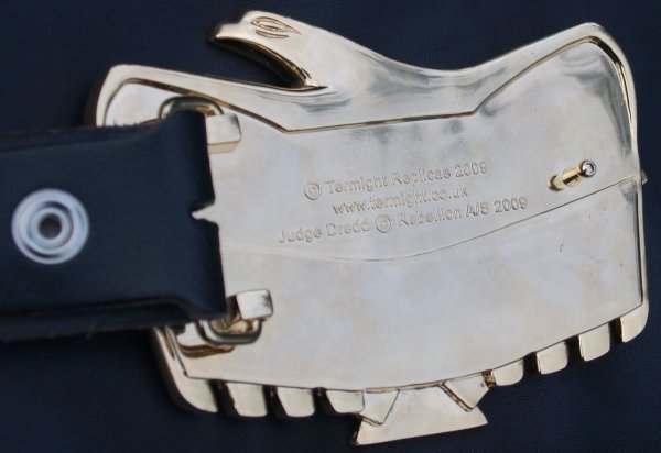 This licensed Judge Dredd buckle has been cast in Zinc Alloy and then gold plated (24 carat) with an enamelled flag on the front. It is 9cm tall x 12cm wide x 1cm thick with a 4cm belt loop and a spike on the reverse so it can be attached to a belt. The buckle costs £39.95 and suitable 1.5" wide black leather belts are available for £9.95. If you have any questions or comments please email me at < >. UPDATE 2 June 2011 Dredd buckles are back in stock. If you pre-ordered, your buckle will be shipped within the next few days. |